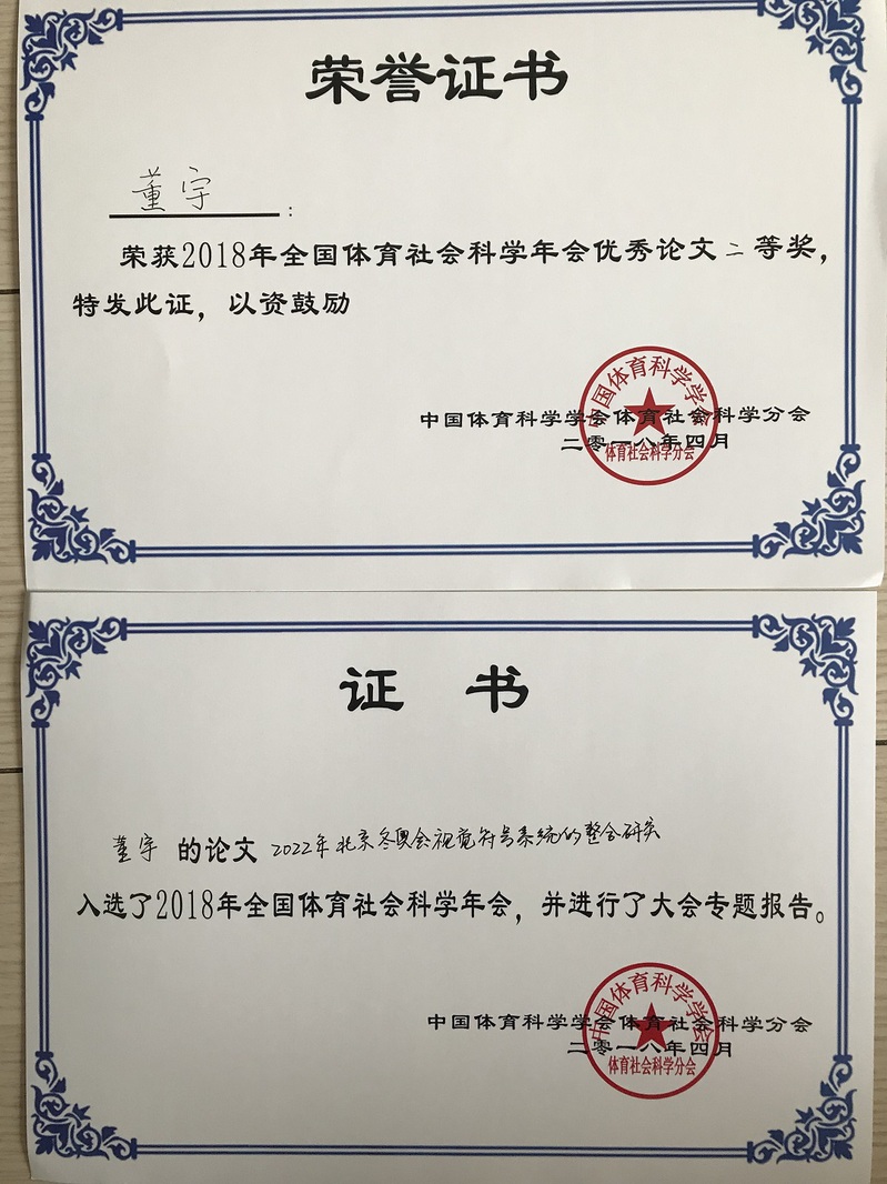 会议共分为开幕式、大会主报告、专题报告三个环节。国家社科评审委员体育学组长、国务院学位委员会体育学科评议组召集人杨桦教授做大会报告《体育人文社会科学研究现状和主要研究领域》,体育学领域资深专家、国社科评审组成员于善旭、凌平、仇军、刘江南、王凯珍、董进霞、黄亚玲、张锐教授客座圆桌论坛:“新时代的体育改革与发展”。此次专题报告评审通过现场专家与报告人共同投票的方式决定,并设每个专题报告会场一等奖1名、二等奖2名。我部董宇副教授作专题报告《2022年北京冬奥会视觉符号系统的整合研究》,并获得专题报告二等奖。