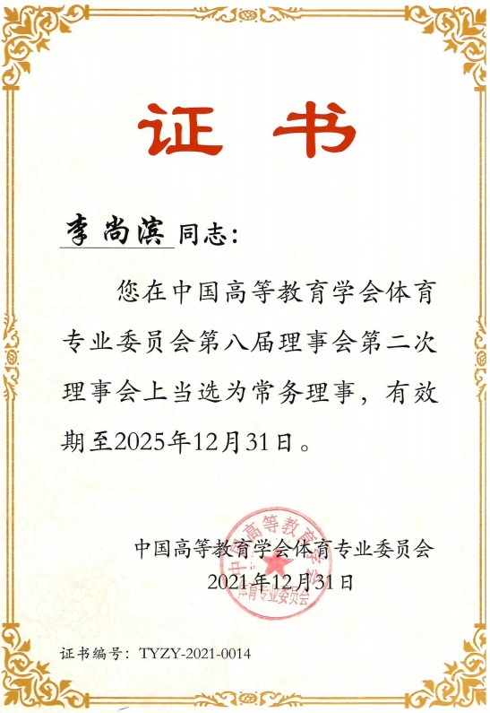 2020年11月4日中国高等教育学会体育专业委员会第八届会员代表大会在山西大同大学召开,我部李尚滨教授在中国高等教育学会体育专业委员会第八届理事会第二次会议上当选为常务理事。