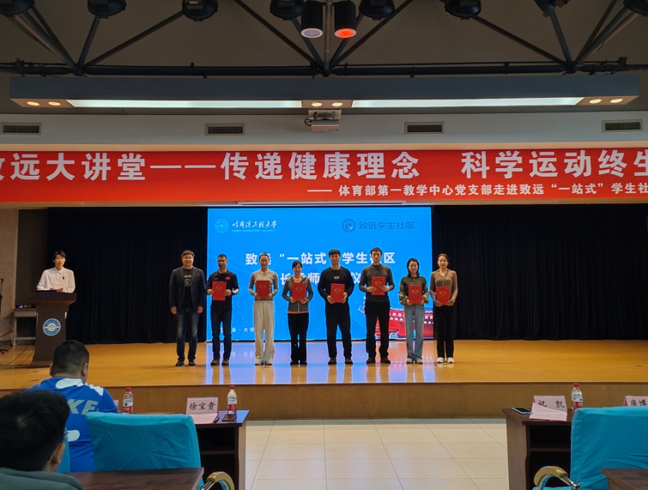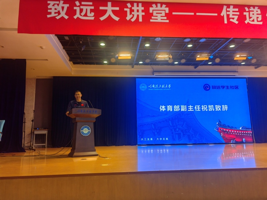 体育部副主任祝凯致辞。他说,“一站式”学生社区要以学生成长为中心,而体育是“五育并举”中的重要一环,也要服务学生成长。体育部积极加入“一站式”学生社区的建设中,把优质的育人资源和育人力量下沉到社区,“以体育人”,服务学生成长。同时,也在和各公寓社区积极沟通,筹建武术、体育舞蹈、健身气功、瑜伽、啦啦操等学生社团,要使每个学生社区都有体育类社团。这次体育部的优秀教师受聘担任致远社区的成长导师和李老师的精彩讲座,是体育部和致远社区携手发展的良好的开端。希望同学们都能够在体育锻炼中享受乐趣、增强体质、健全人格、锤炼意志。未来,体育部将持续以党建工作为纽带,积极搭建与社区共建共筑的桥梁,深入推动教师党员实践服务工作的有效开展。
