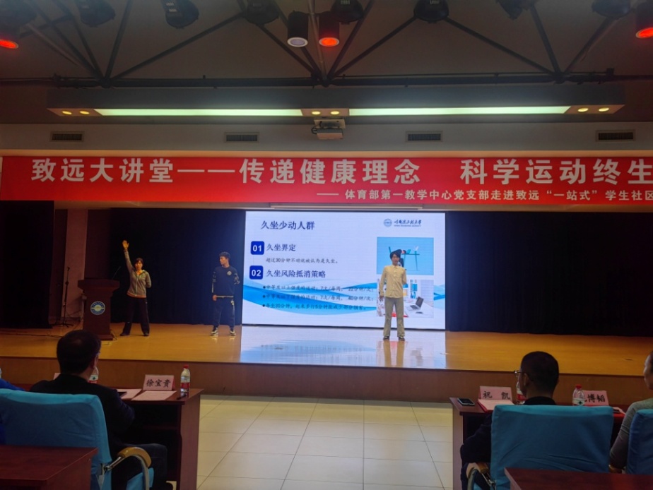 为构建“三全育人”思政大格局,夯实“一站式”学生社区工作,11月15日,体育部第一教学中心党支部走进“一站式”学生社区,李小兰副教授在启航活动中心多功能厅为六公寓学生社区开展致远大讲堂《传递健康理念,科学运动终生》讲座。体育部副主任祝凯,智能学院党委副书记、致远社区管委会主任徐宝贵,体育部第一教学中心党支部书记庞博韬,第一教学中心4位党员教师,智能学院辅导员和致远社区360名学生参加了此次活动。活动由致远社区学生会执行主席黄驰主持。