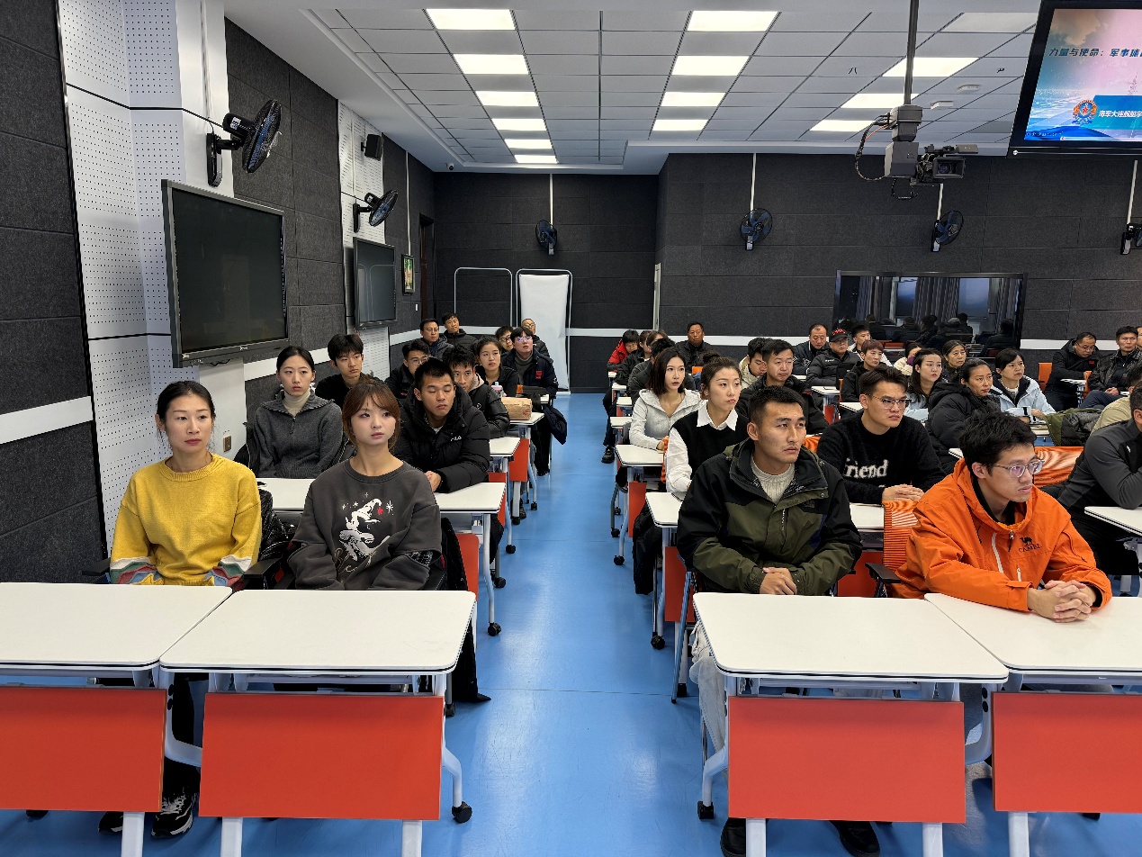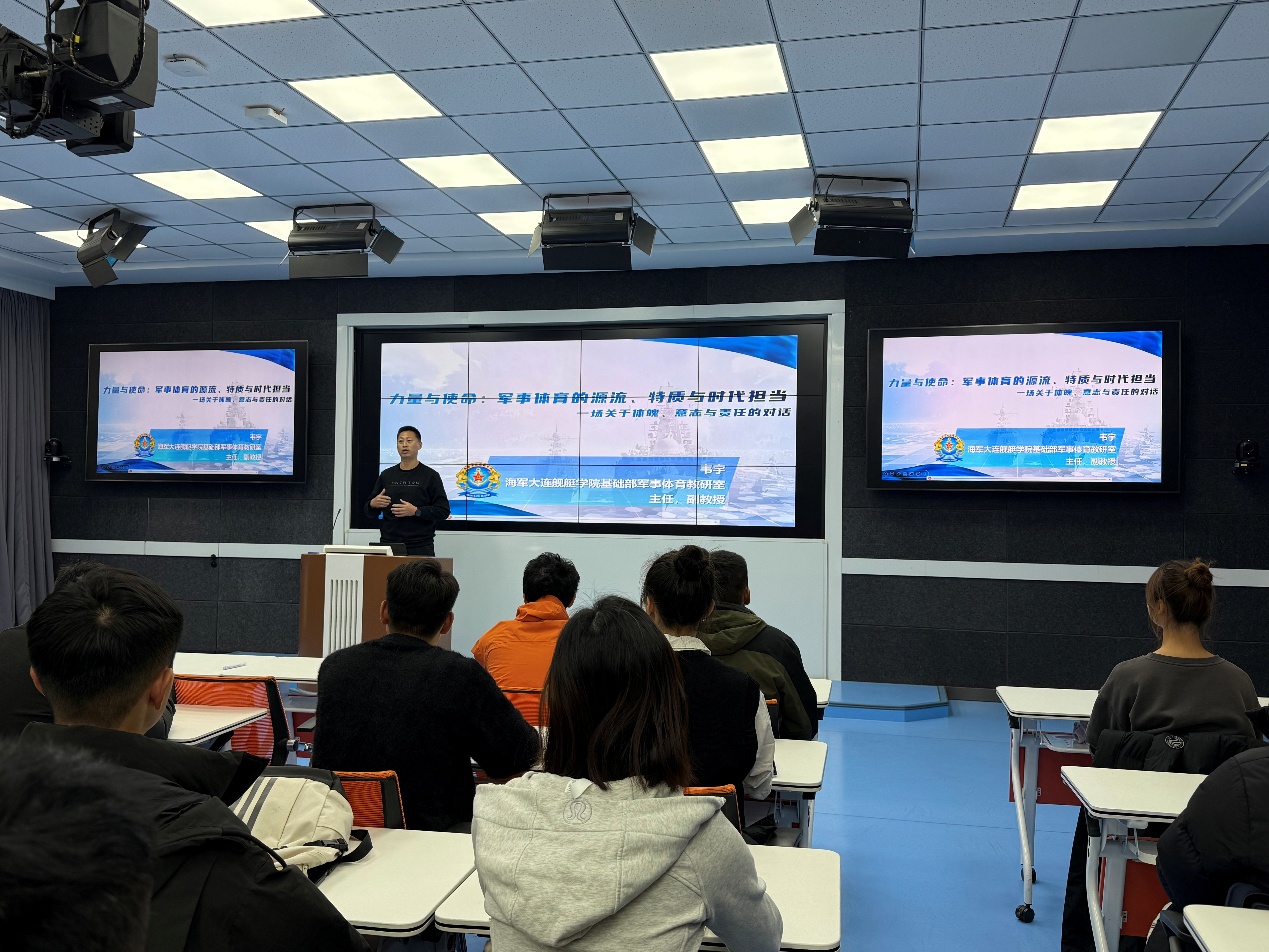 韦宇介绍了基础体能、战斗体能、实用技能三大训练模块的构建理念与实施路径。他说,现代军事体育已从“经验型训练”转向“科学化训练”,融合运动生理学、生物力学、心理学等多学科知识,实现训练过程的个性化与精准化。他希望大家在掌握基本运动技能与教学方法的基础上,关注国防体育的发展趋势,积极参与军事体育相关的课题研究与实践项目。此外,他还分享了智能化训练设备、康复保障体系、实战化模拟平台等在军事体育中的应用进展,展现了军事体育作为交叉学科的前沿动态。