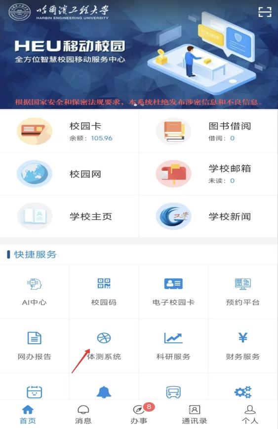 手机端:HEU移动校园→预约平台→体测预约